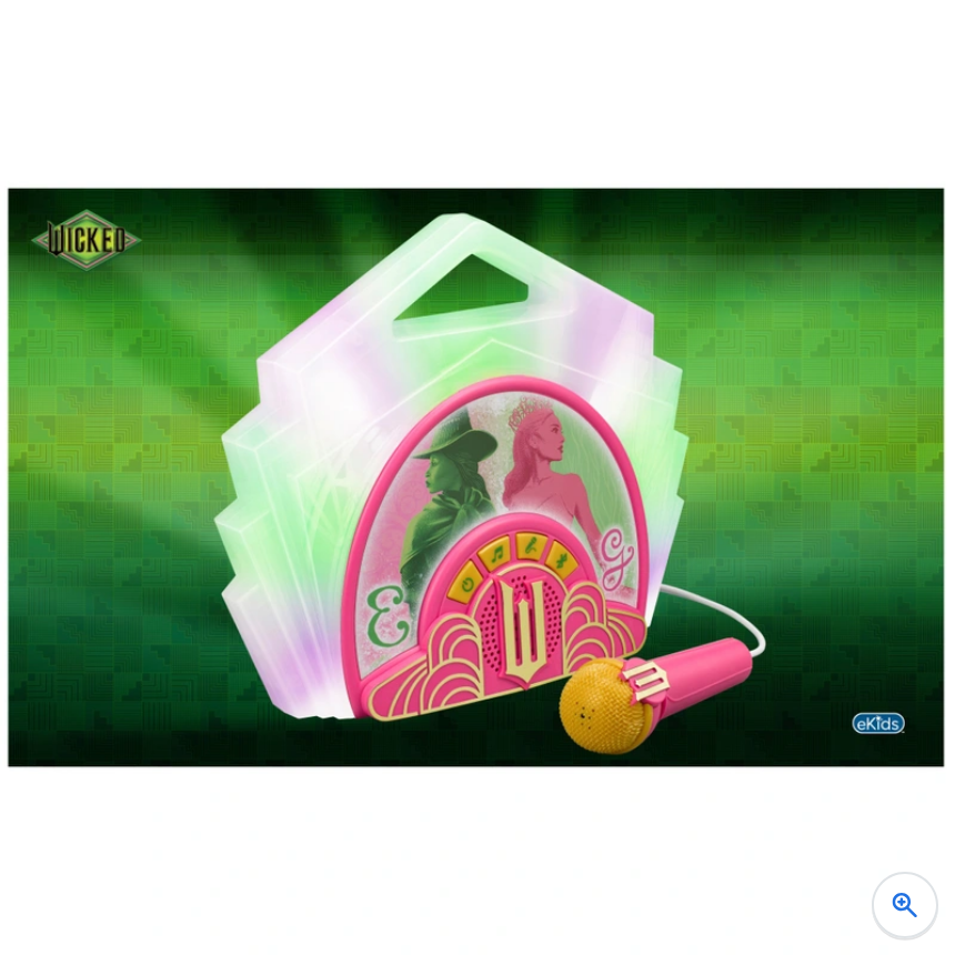 Step into the spotlight with the Wicked Sing-Along Bluetooth Boombox, perfect for fans of the iconic musical film! Designed for budding performers, this karaoke machine lets you sing along to your favorite tunes with ease. Connect your music device via Bluetooth to stream popular playlists or enjoy built-in clips of "Defying Gravity" and "Popular."